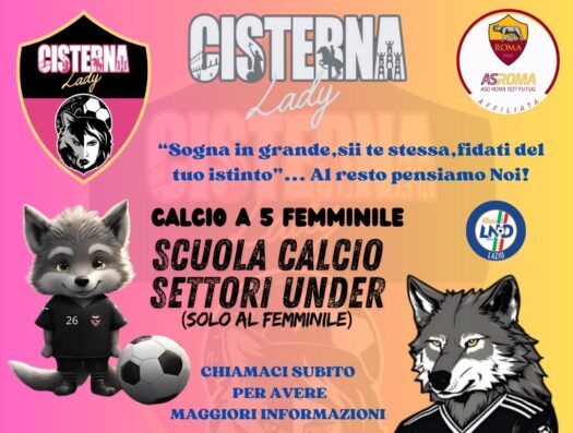 Nasce la scuola calcio in “rosa”. La società Cisterna Lady continua il suo impegno nel futsal, guardando con attenzione al futuro, rafforzando l’idea di crescere e sviluppare progetti a lungo termine. Il settore giovanile da oggi è una realtà, un’opportunità per far crescere le grandi campionesse di domani, ma soprattutto, per dare un’occasione alle giovani generazioni di Cisterna, di essere parte integrante di un progetto calcistico alla ricerca di appassionate lupacchiotte del calcio a 5.