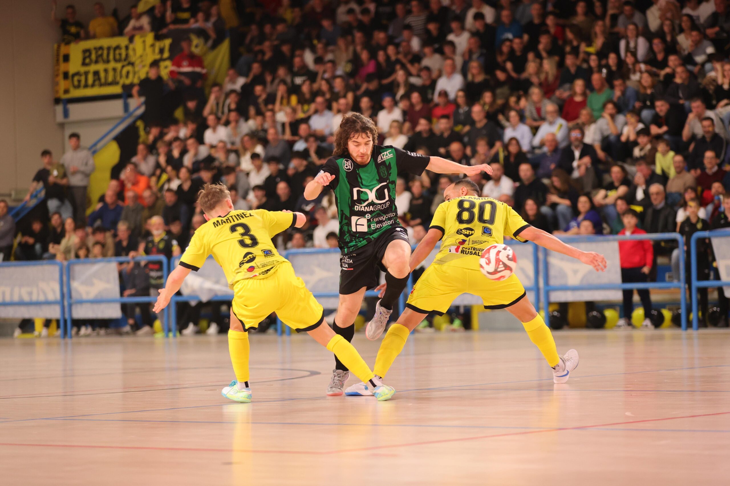 PalaPrata gremito di tifosi per il sentitissimo derby. Un clima da categoria superiore porta ad un inizio di match sussultato con i neroverdi che provano a cercare le prime combinazioni offensive. Tensione e agonismo in campo si sentono tant’è che il primo giallo arriva già al minuto numero 2 con Botosso che interviene in ritardo su Vascello in presa. Tuttavia nulla di concreto succede fino al 5° minuto quando Bernardi deve superarsi sul tiro dal limite di Minatel. La respinta innesca il contropiede del Maccan Prata che termina con il tocco di Marcio appena dentro l’area di rigore, disinnescato in tuffo da Vascello. Protagonisti ancora i neroverdi con Stendler che calcia da posizione siderale ma il destro non esce di molto alla destra di Bernardi. Al giro di boa è Vascelloa salire in cattedra: doppio intervento monumentale che salva il Pordenone: punizione di Botosso, respinta corta del numero uno neroverde ma la risposta sulla respinta di Marcio è da applausi. Ancora il numero 8 locale protagonista con un’involata sulla sinistra, questa volta la conclusione rende più agevole la deviazione in corner di Vascello. Il Pordenone capitola sull’ennesima copertura troppo leggera su Marcio. Il Maccan riparte ed è micidiale: Ben Lamrabet taglia il campo per il compagno di squadra lasciato libero dalla difesa neroverde che sigla il più facile dei gol a porta vuota. Avanti il Maccan nel derby ma la risposta arriva subito con Stendler. Lo sloveno riprova la conclusione da distante e questa volta colpisce sorprendendo Bernardi sul palo più vicino. Parità ristabilita. Nei minuti finali protagonista ancora Bernardi: il numero uno locale mura prima Grigolon a colpo sicuro e poi ancora Stendler su conclusione da fuori area. Si va a riposo in perfetta parità.