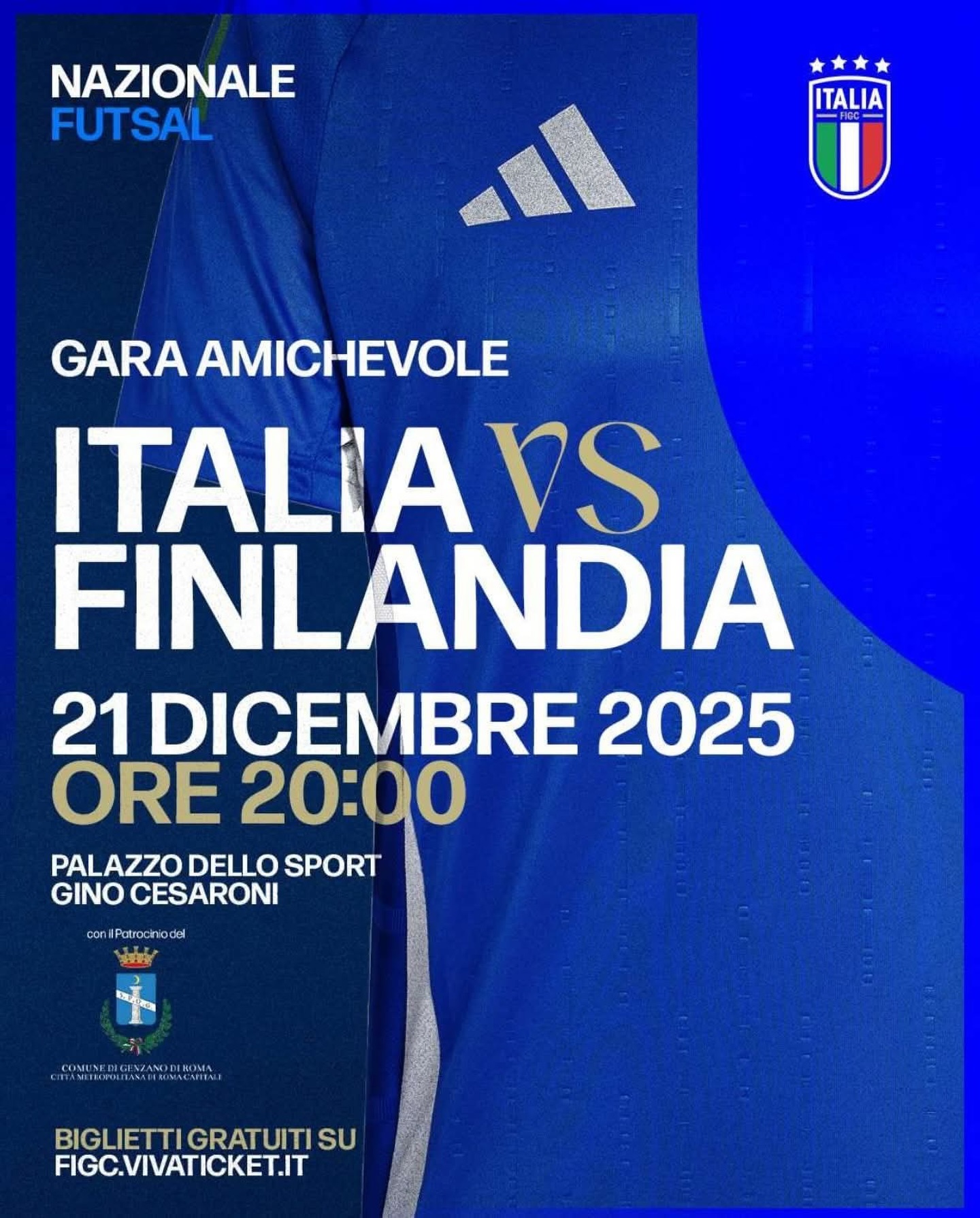 La società Ecocity Futsal Genzano e il Comune di Genzano di Roma hanno l’onore di ospitare, Domenica 21 dicembre al PalaCesaroni, l’ultima amichevole pre Europeo della Nazionale di Calcio a 5.