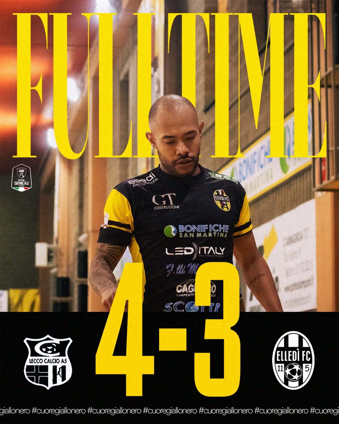Seferi, assistito da Anderson, scrive il poker (4-0) da buona posizione. A 8’39” dalla sirena finale, Sandri trova lo spazio per passare con un diagonale rasoterra preciso (4-1). Nell’ultimo giro di lancette, con il portiere di movimento l’Elledì trova due marcature con un’autorete di Lucho e Novo (4-3). Non c’è però più tempo per impattare e il Lecco si prende i 3 punti in palio.