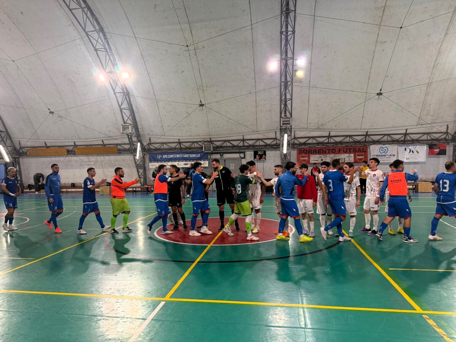 Alla tendostruttura di Sant’Agnello, complice il campo ridotto, il ritmo è altissimo e le occasioni fioccano. Il Sorrento si affida soprattutto a Fred, protagonista di un serrato duello con Massaro, ancora una volta titolare. È proprio Fred ad accorciare all’11’, ribadendo in rete una respinta del portiere biancoblù.
